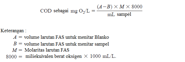 Prinsipnya adalah dengan mereduksi ion dikromat (Cr2O72-) sehingga menghasilkan ion Cr3+ dan menitar kelebihan ion dikromat yang tidak tereduksi dengan larutan Ferro Ammonium Sulfat (FAS) dengan adanya indikator ferroin. Metode ini dilakukan dengan tahapan refluks selama 120 menit (2 jam) pada suhu 150oC yang dapat dilakukan secara terbuka maupun tertutup dan dilanjutkan dengan tahap titrasi. Nilai Chemical Oxygen Demand (COD) kemudian dapat dihitung dengan rumus berikut :
